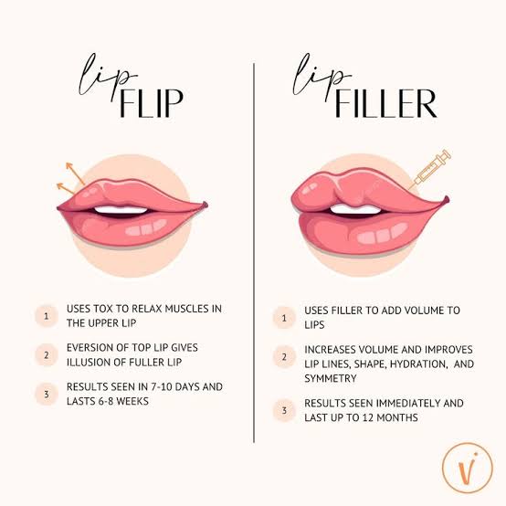 A lip flip enhances the shape and flip of your lip with Botox, while fillers add volume using substances like hyaluronic acid.